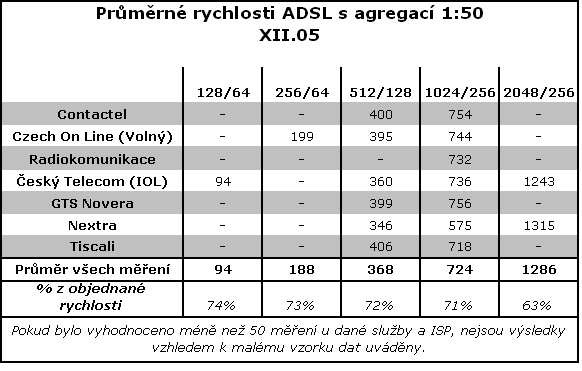 Důvody nárůstu průměrných rychlostí ADSL jsou zejména ve snižování cen rychlejších přípojek v síti Českého Telecomu a v migracích zákazníků na vyšší rychlosti. Vliv má také zmiňovaný nárůst počtu přípojek na principu pronájmu místní smyčky, které dosahují ve srovnání s Českým Telecomem více než dvojnásobných rychlostí. Tento rozdíl chce Český Telecom v nejbližších měsících snížit pomocí migrací stávajících ADSL zákazníků pomalejších služeb na služby rychlejší (např. ADSL zákazníci s rychlostí 128 kbit/s budou migrování na 512 kbit/s) a dalším zatraktivněním cen rychlejších přípojek. Poskytovatelé kabelového internetu nepociťují ze strany svých zákazníků poptávku po ještě vyšších rychlostech, a tak se jejich slušné rychlosti v průběhu loňského roku nezměnily. Rychlosti kabelového internetu stále zůstávají ve srovnání s ADSL v síti Českého Telecomu dvojnásobné a jsou tak srovnatelné s ADSL na principu pronájmu místní smyčky, což nám potvrzuje následující tabulka.