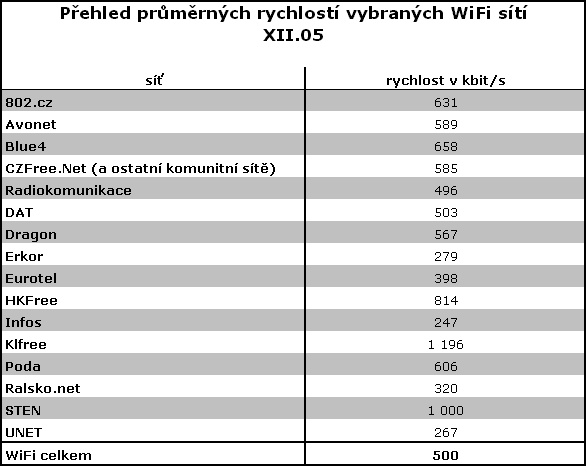 Nakonec si prohlédněme tabulku dosahovaných rychlostí v největších WiFi sítích.