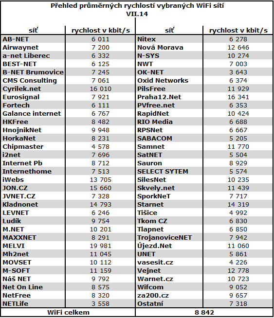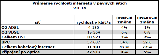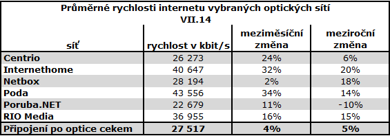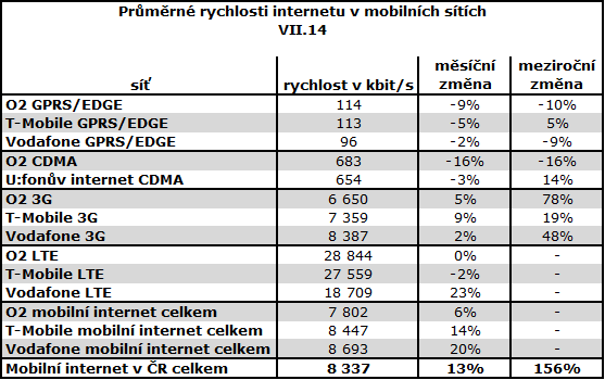 Zrychlení kabelového internetu od UPC vlivem prázdninové akce pro stávající zákazníky. Nejvyšších průměrných rychlostí v mobilních sítích dosáhl tentokrát Vodafone s 8,7 Mbit/s, následován těsně T-Mobilem s 8,4 Mbit/s a O2 se 7,8 Mbit/s. Mobilní internet meziročně roste o 156%.