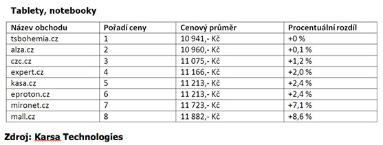 Průzkum společnosti Karsa Technologies dále ukázal na výrazné rozdíly v cenách u konkrétních kategorií produktů. Právě u nich se totiž projevuje rozdílná cenová strategie jednotlivých e-shopů. „Pokud se zaměříme na srovnání cen u konkrétních kategorií výrobků v obchodech, je dobře patrné, že každý e-shop je silný u jiných typů produktů. Například při koupi tabletu či notebooku si silnou pozici na trhu udržuje tsbohemia.cz a alza.cz, kteří nabízejí toto zboží v průměru za 10 941 Kč, respektive 10 960 Kč. Naopak průměrná cena u obchodního domu mall.cz činí v této kategorii 11 882 Kč, což představuje rozdíl 8,6 %,“ upozorňuje Michal Ježek ze společnosti Karsa Technologies, která nabízí provozovatelům internetových obchodů nástroj pro analýzu cen produktů v reálném čase i denní reporting konkurence.