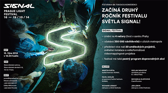 Centrum Prahy ožije na čtyři říjnové večery světlem. Již druhý ročník festivalu světla SIGNAL, který proběhne od 16. do 19. října 2014, představí to nejlepší ze světové i domácí umělecké scény moderního audiovizuálního umění. Diváky čekají čtyři videomappingové projekce a více než dvacet světelných uměleckých děl. Konečně známe také detaily všech doprovodných aktivit, které si organizátoři připravili. Můžete se těšit na vernisáže, workshopy videomappingu, malování světlem, plavby loďkami a mnoho dalšího