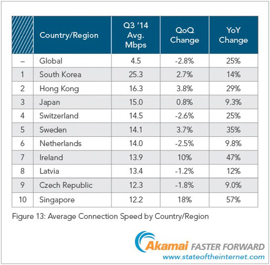 Průměrná rychlost internetu na celém světě je 4,5 Mb/s. Česká republika, která má deváté místo v pořadí, má průměrnou rychlost internetu 12,3 Mb/s. Nejrychlejší internet na světě má Jižní Korea s průměrem 25,3 Mb/s. Jižní Korea má výrazný náskok nad druhým Hong Kongem a celým světem.