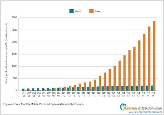 Součástí vydané zprávy je také přehled objemu dat přenesených sítěmi mobilní komunikace po čtvrtletích od roku 2008, kde je vidět enormní nárůst zejména v posledních třech letech, viz. graf níže.