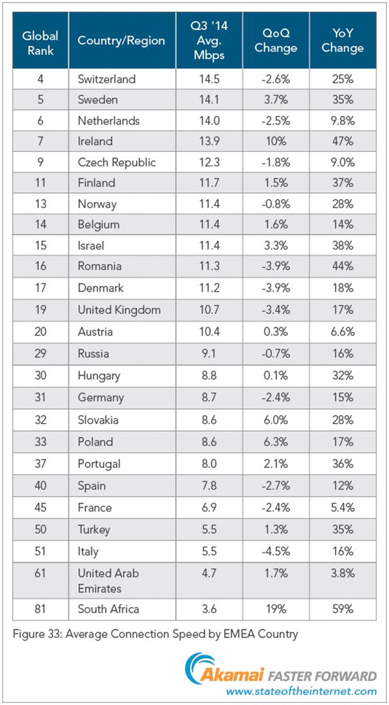 Data zveřejněná agenturou Akamai jsou z třetího čtvrtletí roku 2014. Novější data zatím agentura naposkytla.