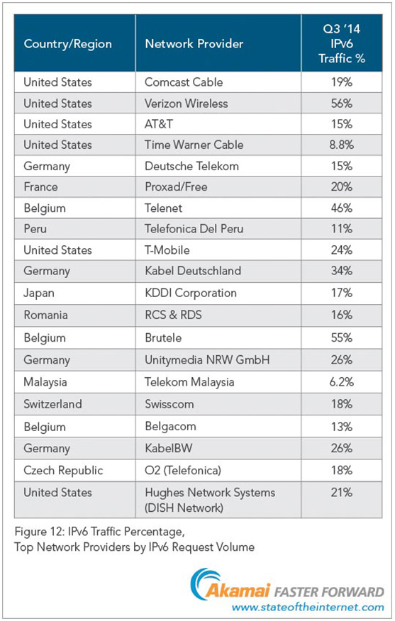 V TOP 10 je Česká republika také mezi zeměmi s nejvyšším podílem provozu v síti IPv6. Podle zprávy Akamai už nový protokol zajišťuje v ČR přenos 5,8 procenta všech dat. V síti O2 už je podíl dokonce 18 procent. Operátor O2 se tak řadí mezi nejaktivnější operátory na světě.
