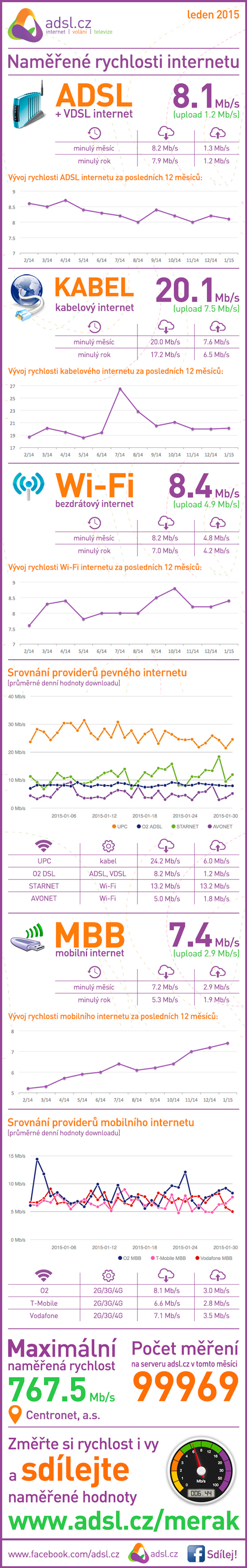 Podle měření z webu ADSL.cz měl v lednu 2015 opět nejrychlejší mobilní internet operátor O2. Nejpomalejší mobilní internet podle měření ADSL.cz má dlouhodobě síť T-Mobile.