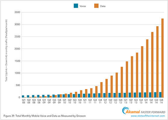 Součástí vydané zprávy je také přehled objemu dat přenesených sítěmi mobilní komunikace po čtvrtletích od roku 2008, kde je vidět enormní nárůst zejména v posledních třech letech, viz. graf níže.