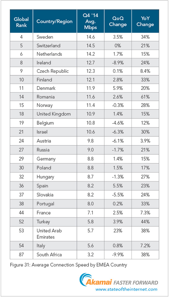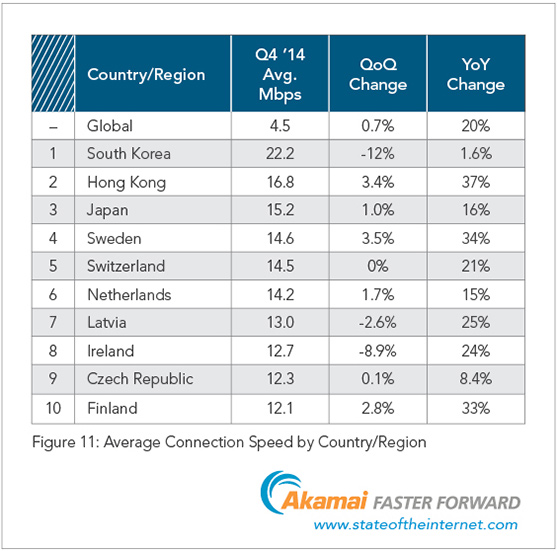 Průměrná rychlost internetu na celém světě je, stejně jako minulý kvartál, 4,5 Mb/s. Česká republika opět získala deváté místo v pořadí, má průměrnou rychlost internetu 12,3 Mb/s. Nejrychlejší internet na světě má Jižní Korea s průměrem 22,2 Mb/s. Jižní Korea má výrazný náskok nad druhým Hong Kongem a zbytkem světa. Podle našeho měření na DSL.cz má ČR za 4. kvartál 2014 průměrnou rychlost pevného internetu 10,6 Mb/s a mobilního 9,89 Mb/s.