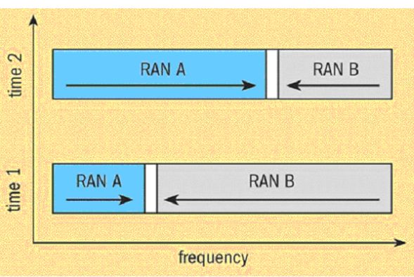 Nejjednodušší varianta DSA se označuje jako průběžné přidělování. Je podobná FSA, ale šířka bloku kmitočtového spektra přiděleného rádiové přístupové síti (RAN, Radio Access Network) se může měnit po krocích, aby se vyhovělo měnícím se podmínkám. Koordinaci si vyžaduje umístění ochranného pásma (guard). V rámci tohoto přístupu se spektrum pro jednu rádiovou síť dělí na úkor spektra pro sousední síť. Jakmile by se takto o spektrum dělilo více rádiových sítí v dané oblasti, byla by koordinace mezi sítěmi složitější (jedna síť by neuvolnila své spektrum, i když její soused by měl pásmo někde jinde ve spektru volné).