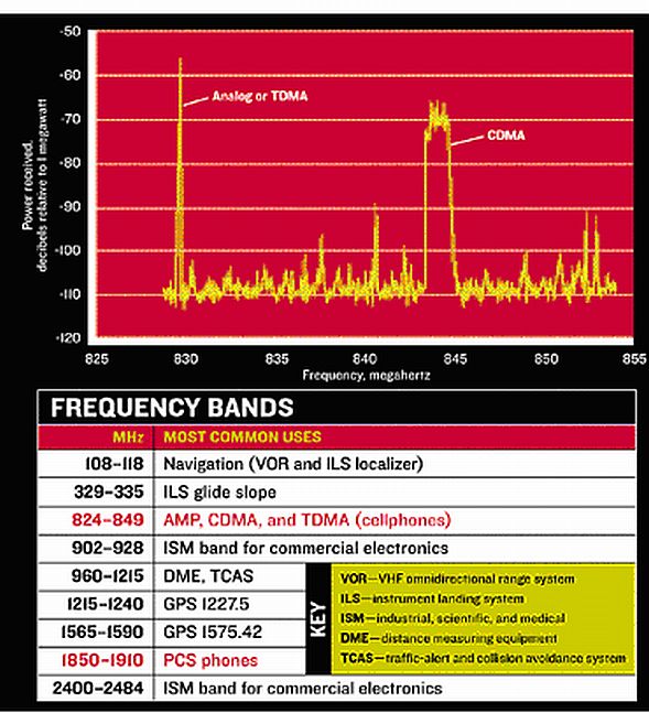 Měření se orientovalo na nejčastěji používaná pásma, především 824-849 MHz pro mobilní komunikaci (analogovou i digitální). V rámci analýzy bylo snadné identifikovat signály z CDMA (Code-Division Multiple Access) mobilních telefonů, ale podstatně hůře šlo identifikovat signály z TDMA (Time-Division Multiple Access) nebo starších analogových telefonů. Přesto se daly označit příslušné signály za mobilní, kvůli vysokým vyzařovacím hodnotám (viz obrázek). U dalších elektronických zařízení vyzařovací výkon není tak vysoký jako u mobilních telefonů, přesto se zjistila vyzařování dalších zařízení pasažérů právě v pásmu používaném GPS. V USA se navíc používá digitální systém PCS (Personal Communications Services) v pásmu 1850-1910 MHz, který není regulován ve stejném režimu jako mobilní komunikace, není proto v současnosti zakázán při letech. Dalším sledovaným pásmem bylo 806-821 MHz používané u iDEN (Integrated Digital Enhanced Network).