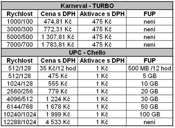 Ceny jsou v tabulce uvedeny s DPH. Jak vidno, nabízené rychlosti jsou poměrně rozdílné u obou společností, ale lze vysledovat, že ceny nejsou od sebe příliš vzdáleny. Zásadní rozdíl ale nalezneme v oblasti aplikace FUP. Zde jasně vítězí Karneval, protože žádné omezení neaplikuje. Služba Chello nabízí (až na jednu výjimku) měsíční FUP interval – pokud překročíte limit daný variantou služby, pak je vám do konce období snížena rychlost na 64/64 kbps, což je skok mnohdy propastný. Bohužel málokdo má asi na výběr mezi těmito službami – dvě kabelové sítě v jednom domě jsou zřejmě raritou.