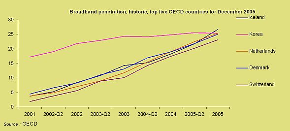 Podle statistických údajů OECD za rok 2005 předstihl Island tradičního „vůdce“, Jižní Koreu, v penetraci rychlých přípojek na 100 obyvatel. V této maličké ostrovní populaci má již každý čtvrtý občan svoji širokopásmovou přípojku. Korea stagnuje a dohání ji i Holandsko, Dánsko či Finsko.