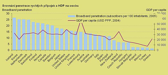 Obrázek 3: Srovnání penetrace rychlých přípojek v roce 2005 a HDP na osobu v roce 2004 (v dolarech; podle PPP, Purchasing Power Parity)