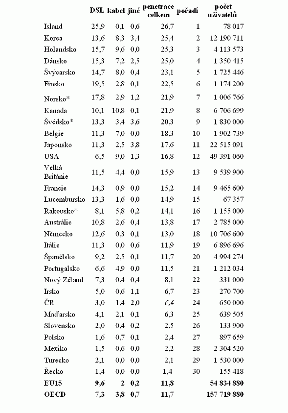Následující tabulka ukazuje pořadí první třicítky zemí světa, které jsou na tom nejlépe z hlediska penetrace rychlých přípojek. Pro snazší vizuální porovnání je tentýž žebříček zaznamenán v grafu (zdroje veškerých údajů: OECD).