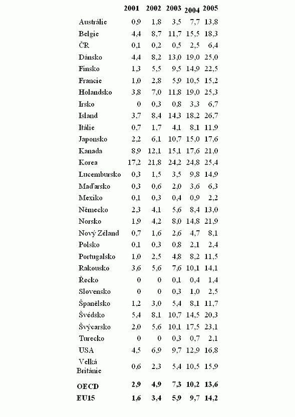 Tabulka 2: Vývoj penetrace širokopásmových uživatelů, 2001-2005