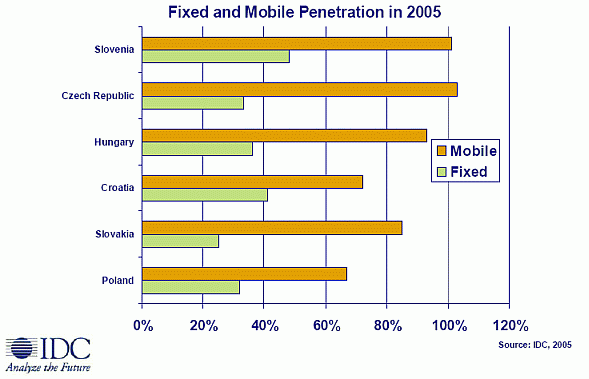 Penetrace mobilních služeb u nás podle průzkumu IDC přesáhla 100 % (víc než jeden mobilní telefon na obyvatele), zatímco penetrace pevných služeb klesla skoro na 30 % (viz následující obrázek). Uvidíme, jak do toho bude zapadat trend konvergence služeb pevných a mobilních.