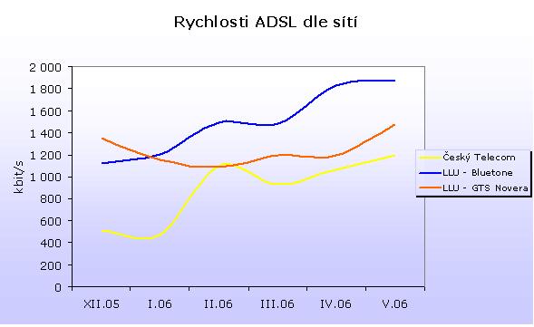 GTS Novery (dříve Telenor Networks). Důvodem je navýšení rychlostí přípojek stávajících zákazníků, které probíhalo v průběhu dubna a května. Vývoj rychlostí ADSL v jednotlivých sítích za posledních 6 měsíců ukazuje následující graf.
