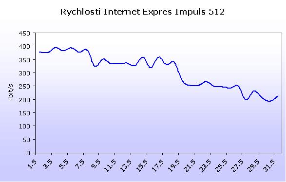 Internet Expres Impuls od Českého Telecomu. Důvodem je opět FUP. Služba Internet Expres Impuls 512 má v porovnání s ostatními nabídkami na trhu velmi nízký limit pro přenesená data před uplatněním FUP ve výši 1 GB za měsíc. FUP je nyní u Českého Telecomu uplatňována podle objemu přenesených dat od začátku měsíce. Silný vliv FUP na celkové průměrné rychlosti tak potvrzuje následující graf.