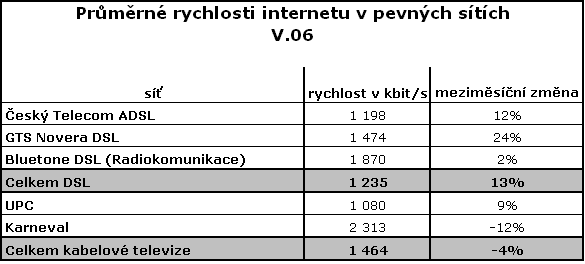 Od tohoto měsíce dochází ke zpřehlednění tabulek rychlostí v ADSL síti Českého Telecomu vlivem vyřazení dnes již nepoužívaných rychlostí 128 kbit/s, 256 kbit/s a 1024 kbit/s. Z používaných rychlostí neuvádíme rychlosti přípojek s nominální hodnotou 768 kbit/s, jejichž skutečnou rychlost častěji měří pouze zákazníci