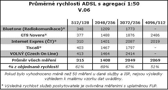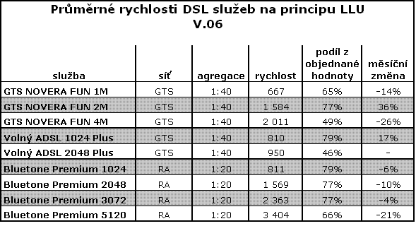 Bluetone Premium od Radiokomunikací. Pravděpodobným důvodem je pokračující nárůst počtu klientů, kdy dochází k postupnému zaplňování jednotlivých agregačních skupin. Nicméně jak je vidět z následující tabulky, rychlosti ADSL na principu LLU v síti Radiokomunikací jsou stále velmi slušné.