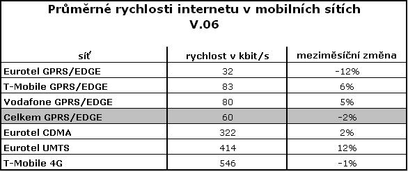 Nejvyšších rychlostí v mobilních sítí dosahují zákazníci T-Mobile. Rozdíl oproti Eurotelu je nejvíce viditelný u služeb v síti GPRS/EDGE. V sítích UMTS (u T-Mobile s obchodním názvem Internet 4G) je T-Mobile zhruba o třetinu rychlejší.