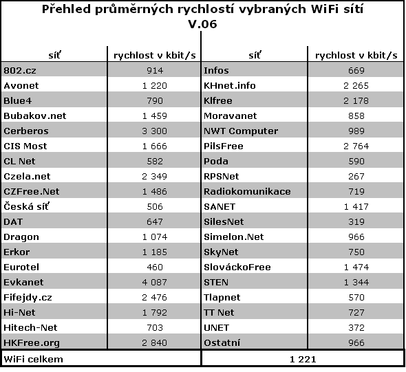Jako tradičně na závěr se podíváme na naměřené rychlosti ve vybraných WiFi sítích.