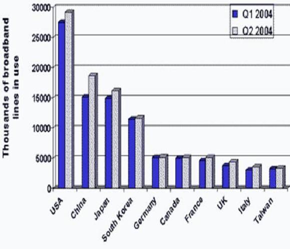 Za dvanáct měsíců se počet širokopásmových přípojek na světě ke konci června 2004 více jak zdvojnásobil! Podle