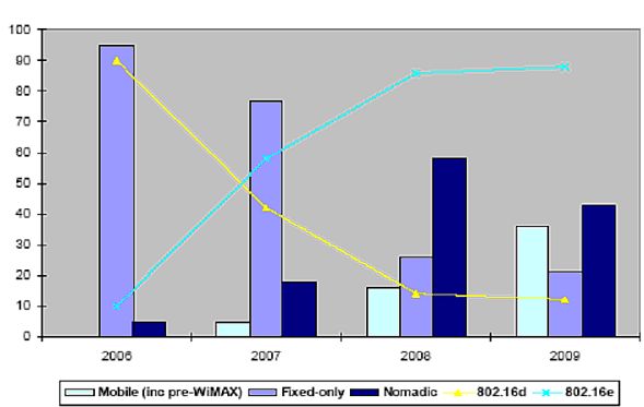 Podle zprávy společnosti ABI Research ("WiMAX Semiconductors: Fixed and Mobile WiMAX: RF and Baseband Chips for Network Infrastructure and CPE") dosáhne v příštím roce svého maxima trh s pevným WiMAX a v roce následujícím se mu již vyrovná trh s mobilním WiMAX (jak napovídá výše uvedený obrázek, analytici se poněkud liší v tom, kdy mobilní WiMAX 802.16e překoná svého pevného předchůdce 802.16d: podle Transmedia již v polovině příštího roku).