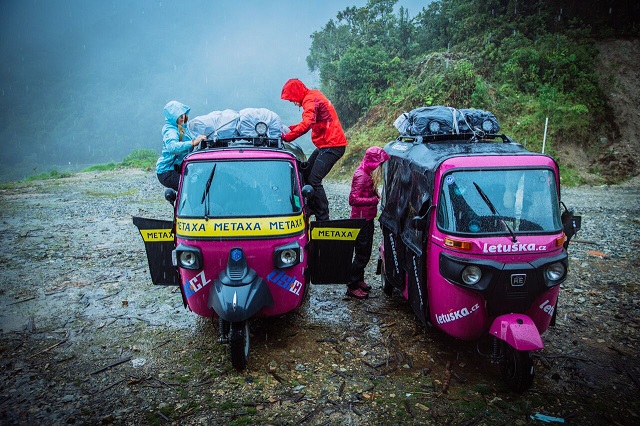 Eliška: Nejdřív jsme pro mikrofon musely vyřešit fantomové napájení, které foťáky nemají a taky uchycení na foťák. Váha celého zařízení se téměř zdvojnásobila. Mám s sebou celkem devět paměťových karet, dvě autokamery pro případ nepředpokládané akce na cestě před námi, které natáčí permanentně do smyček a další dvě kamery pro záběry směrem dovnitř kabiny a zvenku tuktuků. Tři karty mám jen pro foťák. Celkově tedy vezu 840 GB plus další záložní karty a karty do drona, který taky často využíváme.