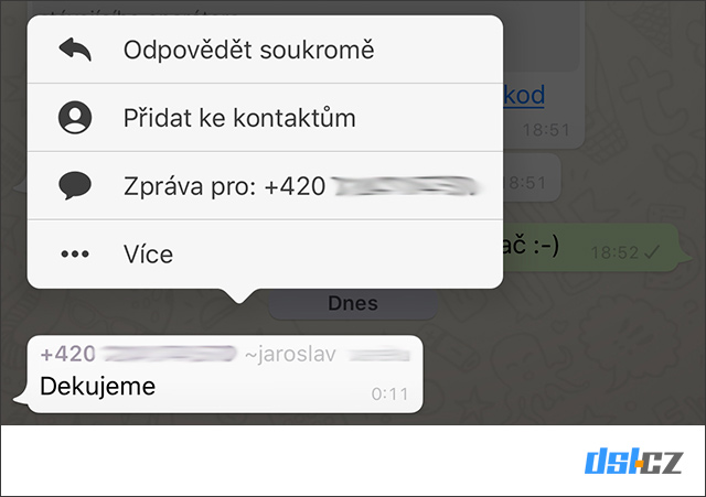 Pokud chcete některému ze členů skupinové konverzace napsat soukromě, stačí, když podržíte na jeho zprávě prst a pod ikonkou tří teček vyberete „odpovědět soukromě“.