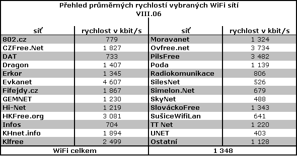 Na závěr bude tradičně uveden přehled dosahovaných rychlostí WiFi sítí, které měly na serveru DSL.cz nejvyšší počty měření. Po delší době došlo k meziměsíčnímu poklesu celkových dosahovaných rychlostí. Stále však většina poskytovatelů WiFi sítí dokáže skutečnými rychlostmi jiným typům připojení k internetu slušně konkurovat.