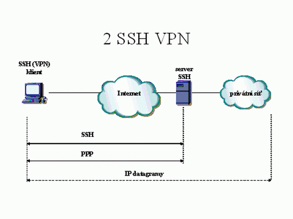 Na doplnění ještě pár slov k poslední alternativě realizace bezpečného vzdáleného přístupu. SSH (Secure Shell) je metoda vzdáleného přístupu prostřednictvím zašifrovaného textově-orientovaného protokolu. Zahrnuje v sobě schopnost pracovat jako tunel pro jiné protokoly (viz obrázek 2). Často se používá klient SSH namísto protokolu Telnet. VPN založená na SSH používá pro navázání síťového rozhraní na místním směrovači protokol PPP.