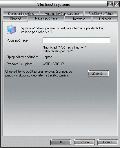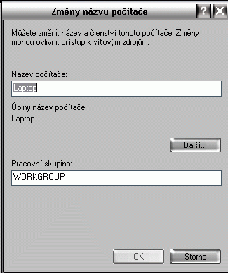 Dříve, než počítače propojíte, je dobré se ujistit, že oba jsou součástí jedné pracovní skupiny. Fungování sítě tímto není podmíněno, ale obecně se doporučuje. Může se stát, že nefunkčnost propojení může být způsobena právě rozdílnými jmény skupin. Klikněte pravým tlačítkem na Tento počítač na ploše, zvolte Vlastnosti a poté kartu Název počítače. Liší-li se na počítačích názvy pracovních skupin, změňte je.
