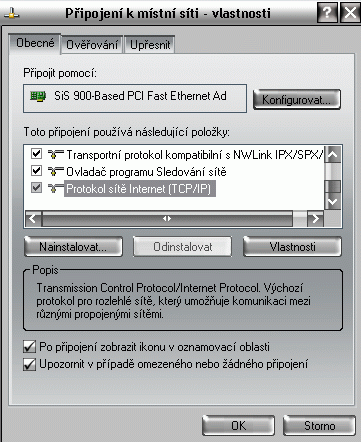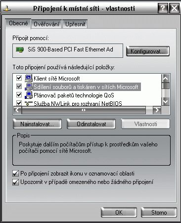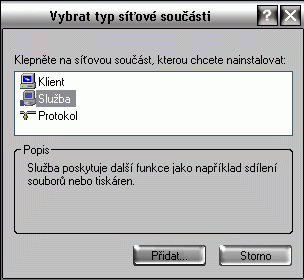 Abyste mohli sdílet soubory a tiskárny v síti (v případě, že vaše tiskárna používá port LPT, kterým není vybaven váš nový notebook, a ta je tak připojena ke staršímu počítači), musíte si nejdříve ověřit, zda sdílení je v systému nainstalováno. Otevřete opět vlastnosti síťové karty (viz výše) a zkontrolujte, zda obsahuje položku Sdílení souborů a tiskáren v sítích Microsoft. Pokud ne, musíte službu nainstalovat. Poklepejte na Nainstalovat, poté Služba a vyberte ze seznamu.