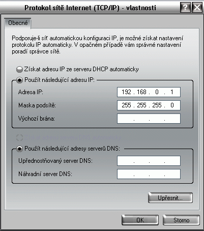 Dále je potřeba nastavit síťové karty. Klikněte na Start, otevřete Ovládací panely, poklepejte na Síťová připojení, klikněte pravým tlačítkem myši na síťovou kartu a zvolte Vlastnosti. Na kartě Obecné otevřete Protokol sítě internet (TCP/IP) a řiďte se dle obrázků níže. Na druhém počítači proveďte totéž, ovšem nezadávejte stejnou IP adresu! Je nutné, aby se IP adresy lišily, takže nejlepší bude, když poslední číslici zvětšíte o jedničku, tj. do kolonky Adresa IP zadáte 192.168.0.2.