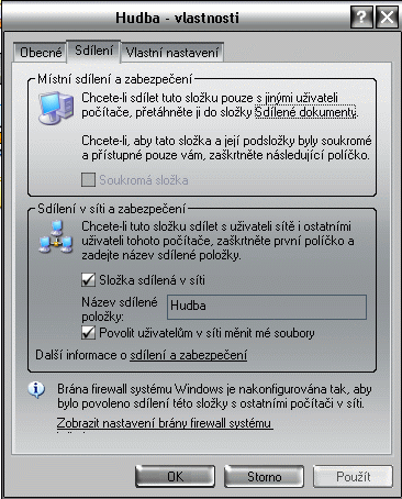 Poté již stačí zvolit složky a tiskárny, jež si přejete sdílet. Jednoduše přejděte na složku, klikněte na ni pravým tlačítkem myši, zvolte Sdílení a zaškrtněte Složka sdílená v síti. Přejete-li si, aby z druhého počítače v síti bylo možné soubory ve složce měnit, zaškrtněte také Povolit uživatelům v síti měnit mé soubory. V případě sdílení tiskárny je postup stejný; stačí v ovládacích panelech otevřít Tiskárny a faxy, pravým tlačítkem poklepat na požadovanou tiskárnu a povolit její sdílení.