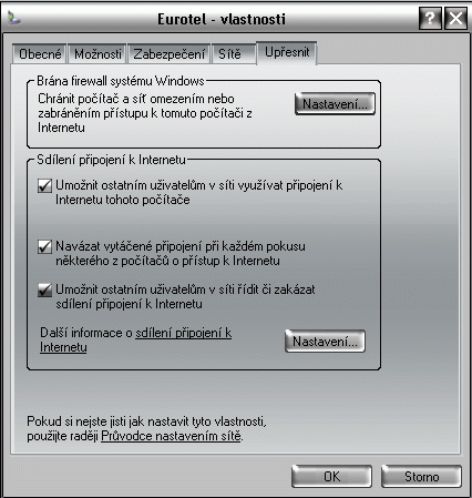 Je-li váš počítač připojen k síti internet např. prostřednictvím telefonní linky (dial-up) nebo mobilního telefonu (i v případě „kabelu“ by se následující postup dal použít, ovšem než používat více síťových karet, bude lepší postupovat, jak je psáno v další kapitolce) a pokud jste provedli stejné kroky, jak je popsáno výše, nic vám nebrání připojení sdílet.