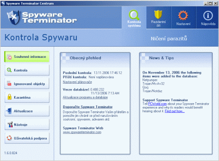 Dalším povedeným kouskem je Spyware Terminator. Tento hlídač v reálném čase vás jistě potěší svou funkčností a účinností (i já si donedávna myslel, že počítač mám vcelku čistý...) ve vyhledání i sebemenších zbytků internetových parazitů. Při podezřelých operacích vás ihned informuje o situaci a ptá se vás na postup (zda akci zablokovat, či povolit). Nově obsahuje taktéž integrovaný antivir s databází obsahující 40 000 virů.
