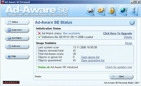 Začněme s tím nejznámějším bijcem spywaru. Je jím Ad-Aware SE Personal . Jde o opravdu spolehlivého pomocníka při hledání a ničení špehovacích programů a i tzv. tracking cookies. Ad-Aware prohledává nejen pevné a výměnné disky, ale rovněž registr a paměť.