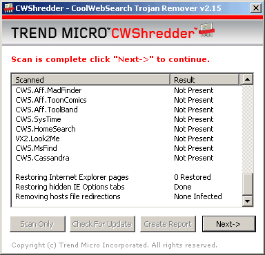 Opravdu existují jednorázové čističe, které umějí vyčistit počítač od konkrétního škodlivého softwaru. Máte-li např. problémy s typem spywaru, který nese označení CoolWebSearch (CoolWWWSearch, zkráceně jen CWS), a nemůže-li váš čistící software problém odstranit, použijte Cool Web Schredder.