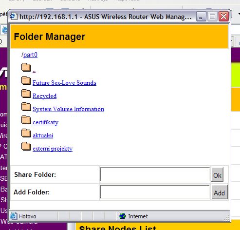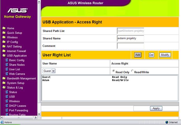 Ve webrozhraní routeru lze vybrat sdílení všech složek disku nebo definovat ty, jenž mohou být dostupné. Pro tyto složky je navíc možné definovat přístupová práva pro jednotlivé uživatele, která vytvoříte. Uživateli lze nastavit Read Ony nebo Read and Write pravomoci a je možné definovat, zda-li bude heslo vyžadováno pro přístup.