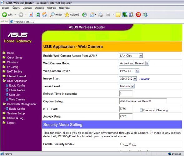 Možnost využít USB kamerku jako síťovou je jistě lákavá. Ceny IP kamery jsou zpravidla podstatně vyšší. ASUS WL-500gP vám tak umožní z běžné webkamery udělat síťovou. Obraz je možné sdílet do celé sítě LAN (samozřejmě i v rámci Wi-Fi) a do WAN. Zobrazení kamerou snímaného obrazu je v zásadě realizováno přes ActiveX prvek v okně prohlížeče. Je možné volit z několika druhů zobrazení, které se liší v kompatibilitě s ostatními prohlížeči (IE, Firefox atp.). Nechybí ani konfigurace pro aktivaci funkce snímání pohybu. V případě, že kamera zaznamená pohyb, může zaslat e-mail (spolu s fotkou). Zajímavostí je možnost nastavit dny a hodiny, kdy má být funkce aktivní.