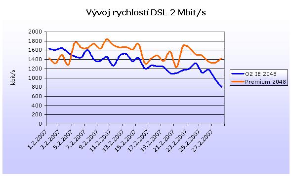 Následující graf ukazuje porovnání vývoje naměřených rychlostí služeb s nominální rychlostí 2048 kbit/s O2 Internet Expres 2048 a Premium 2048 od Radiokomunikací na principu LLU.