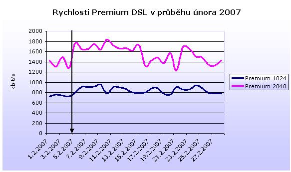 minulý článek o lednových rychlostech naměřených na DSL.cz, který upozorňoval na určitý pokles rychlostí služeb Premium. Následující graf zobrazuje vývoj rychlostí služeb Premium, od kterých je na DSL.cz k dispozici nejvíce měření.
