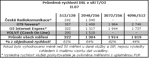 Vraťme se však k minulému měsíci. V tabulce dosahovaných rychlostí DSL služeb jednotlivých poskytovatelů v síti T/O2 již delší dobu k žádným podstatným změnám nedochází. Bohužel to platí i pro průměrné rychlosti ADSL 4 Mbit/s s nedávno navýšeným limitem FUP na 30 GB za měsíc, který zjevně velké množství zákazníků služby stále překračuje. Důsledkem je, že ADSL 4 Mbit/s je pro mnoho zákazníků výrazně pomalejší než udávaná nominální hodnota.