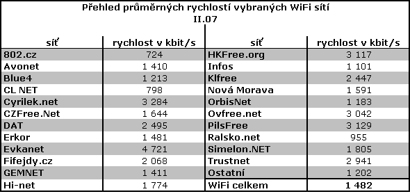 Poslední tabulkou je přehled WiFi sítí, u kterých bylo na DSL.cz ve sledovaném období zaznamenáno více než 200 platných měření rychlostí.