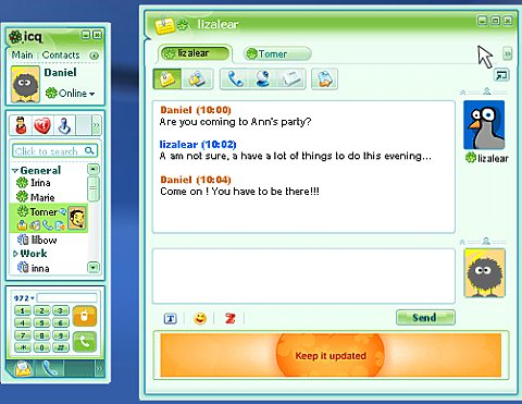 ICQ ve verzi 6 je dostupné prozatím jen v anglické lokalizaci, ale myslím, že během několika dnů či týdnů bude uvolněna také česká verze. V této nové verzi naleznete kromě jiného zásadní inovaci vzhledu uživatelského rozhraní, které také nabízí odesílání textu přímo z hlavního okna ICQ bez nutnosti otvírat komunikační okno a záložky, díky kterým lze mít v rámci jednoho konverzačního okna otevřít mnoho rozhovorů. K dispozici je samozřejmě i hlasová komunikace, posílání SMS, konferenční textová komunikace a další zajímavé funkce. Vylepšeny jsou i funkce prohlížeče historie. Celkově působí ICQ 6 poměrně hezkým a uceleným dojmem.