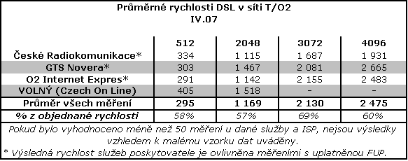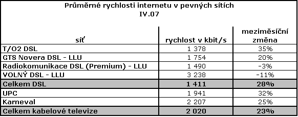 Nejzajímavějšími údaji v tabulce dosahovaných rychlostí internetu v pevných sítích je změna průměrných rychlostí DSL služeb v síti Telefóniky O2 (T/O2) a zmíněného kabelového internetu.