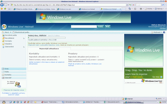 Společnost Microsoft spustila novou verzi populární freemailové služby Hotmail, a to i v češtině. Windows Hotmail Live, jak se nyní nazývá, nabízí uživateli zdarma 2 GB prostoru, nový vzhled na bázi Vist a nové funkce. V rámci registrace má člověk ale k dispozici spoustu služeb. Namátkou blog, nástroj pro optimalizaci počítače, antivirový scanner...