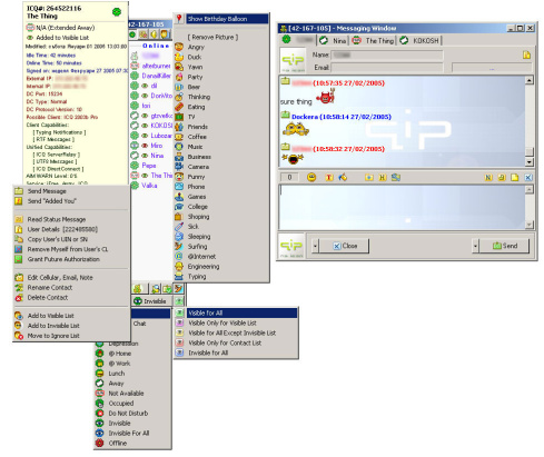 Zastavme se chvíli u nastavení viditelnosti a u rozšířených možností aplikace. Viditelnost či neviditelnost má v QIP mnoho podob. Základem jsou standardní statusové režimy jako On-line, Off-line, V práci, Doma, Na obědě apod. Každý z těchto režimů lze pak rozšířit o speciální emotikon s textem. Toto umí i klasické ICQ, ale QIP nastavíte rychleji a máte na výběr více emotikonů. Viditelnost lze nastavit v těchto krocích: Viditelný pro všechny, Viditelný pro seznam „Viditelný“, Viditelný pro všechny mimo seznam „Neviditelný“, Viditelný pouze pro seznam mých kontaktů a Neviditelný pro všechny.